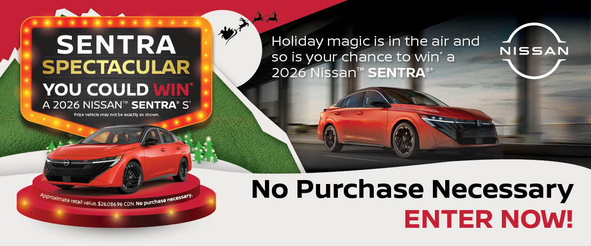 *NO PURCHASE NECESSARY. Subject to Official Rules at https://sentra-spectacular.nissangiveaway.ca/official-rules, including a list of participating dealers and how to enter without visiting a participating dealer. The contest ends at 11:59:59 P.M. AST on December 31, 2025. Open to legal Canadian residents who reside in the provinces of Nova Scotia, New Brunswick, and Newfoundland and Labrador, and are of the age of majority in their respective provinces at the time of entry. To enter, scan the QR Code or enter the website domain found on any Contest advertisement and complete the entry form. One (1) Prize (the "Prize") available to be won consists of a 2026 NISSANTM Sentra® S vehicle in Energetic Ember with an approximate retail value of $26,086.96 CDN. The odds of winning depend on the total number of eligible entries received during the Contest Period. A random draw will be held on January 12, 2026. The selected entrant must correctly answer a mathematical skill-testing question and complete a Declaration and Release of Liability Form.